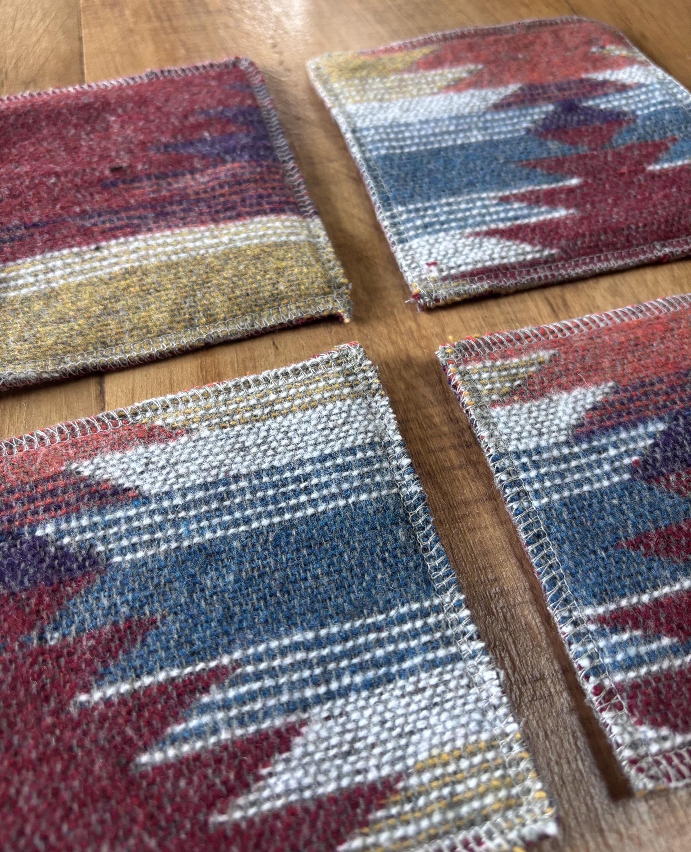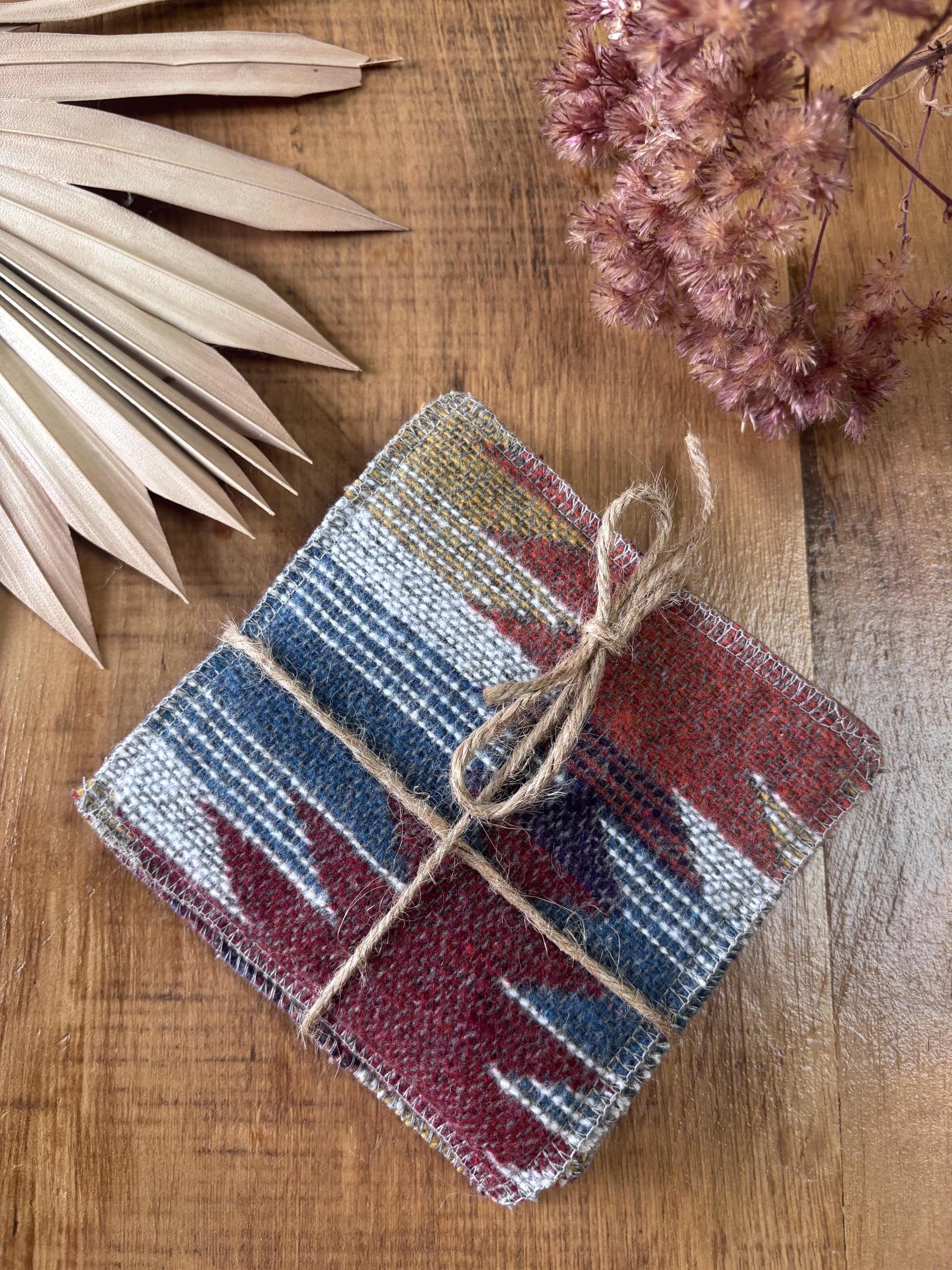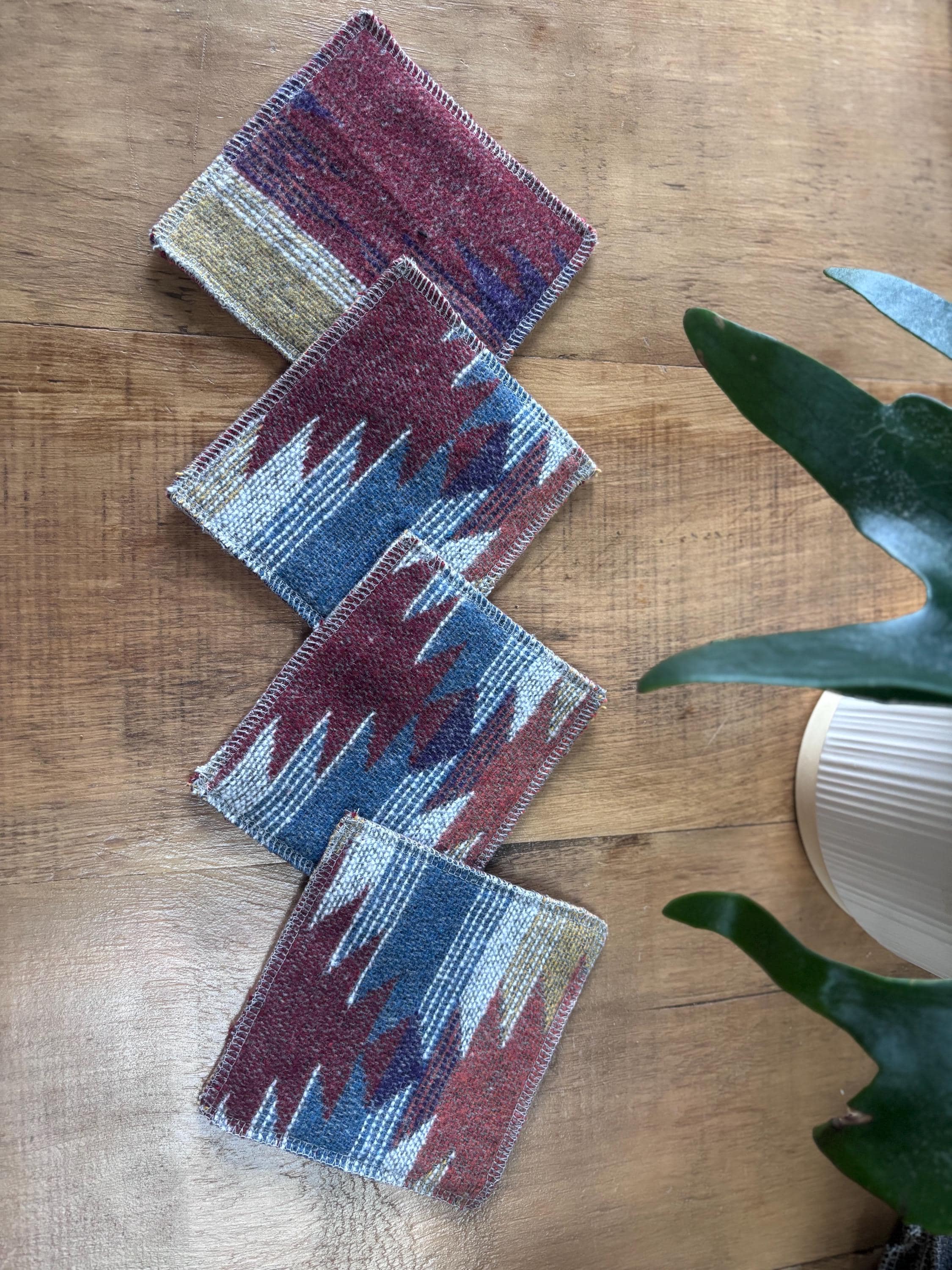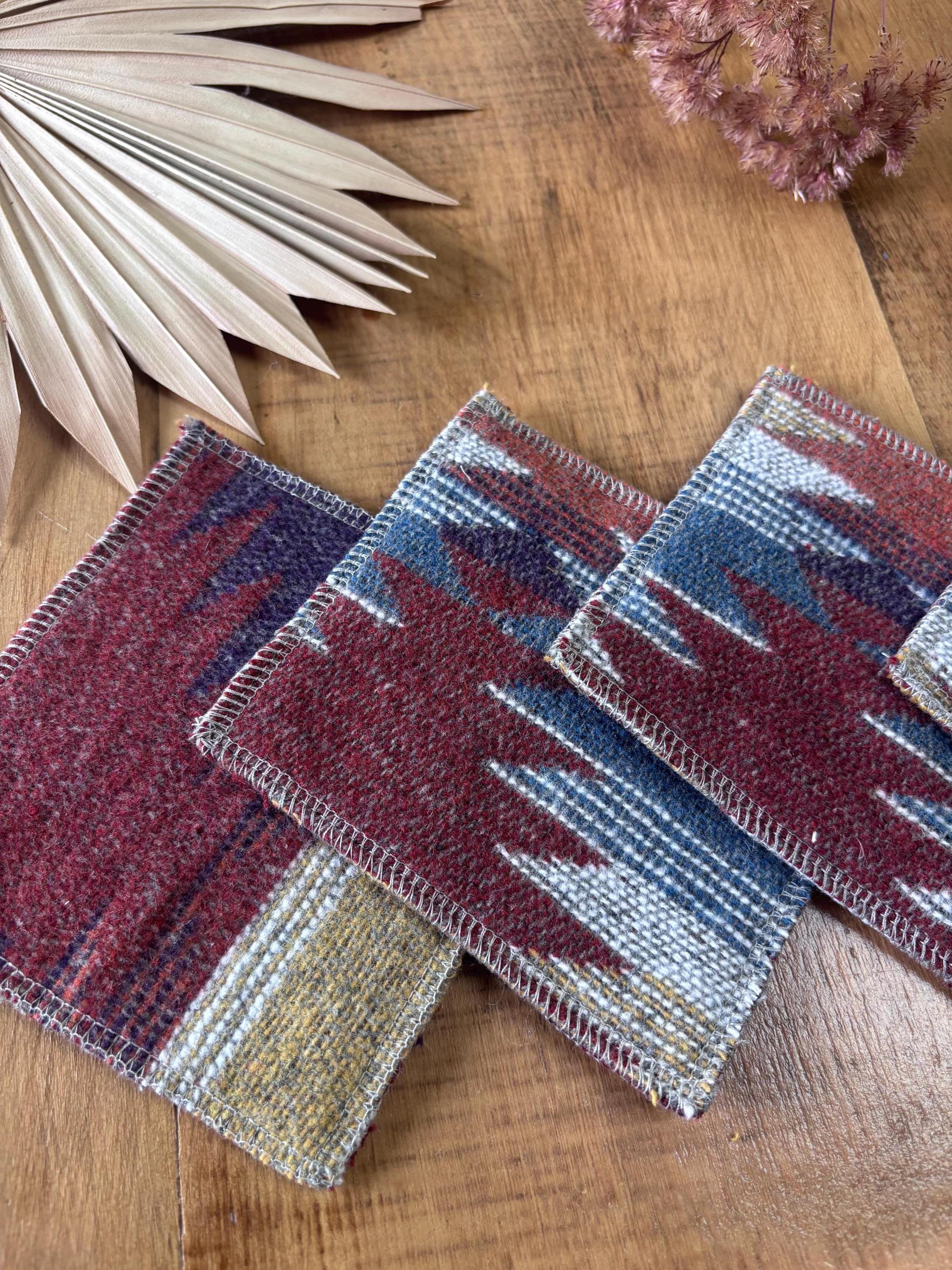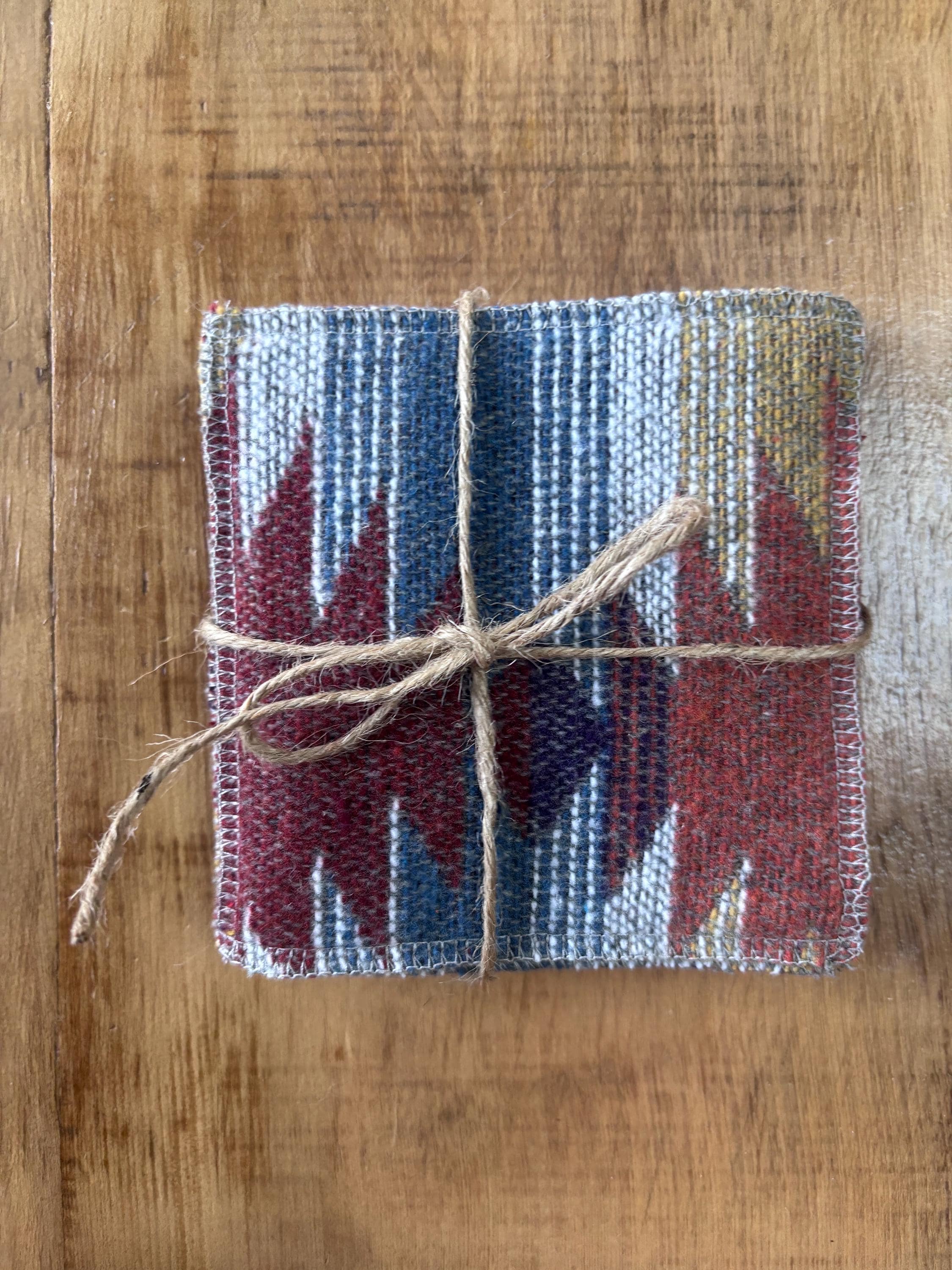 These are sustainably made using offcuts of fabric so please note that colours and patterns vary for each coaster and all sets are unique. Fabric is of various colors, geometric shapes, stripes and woven designs.