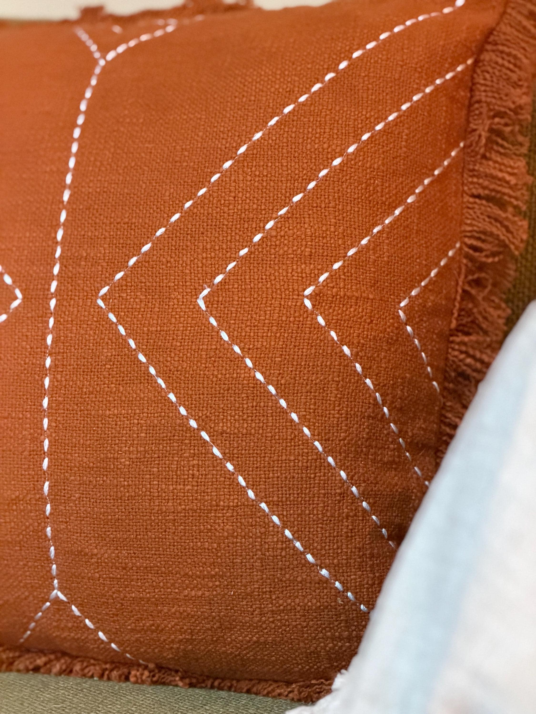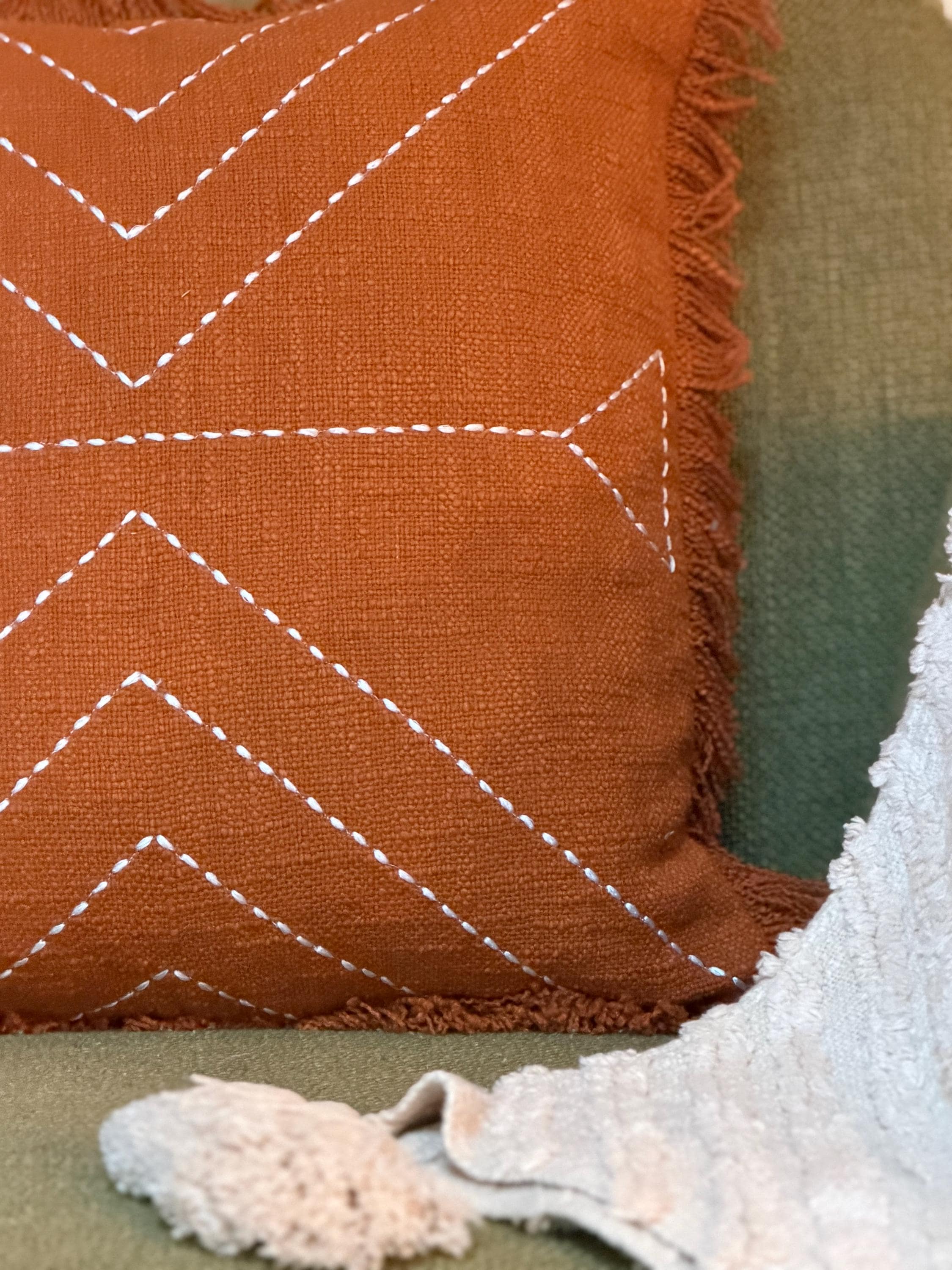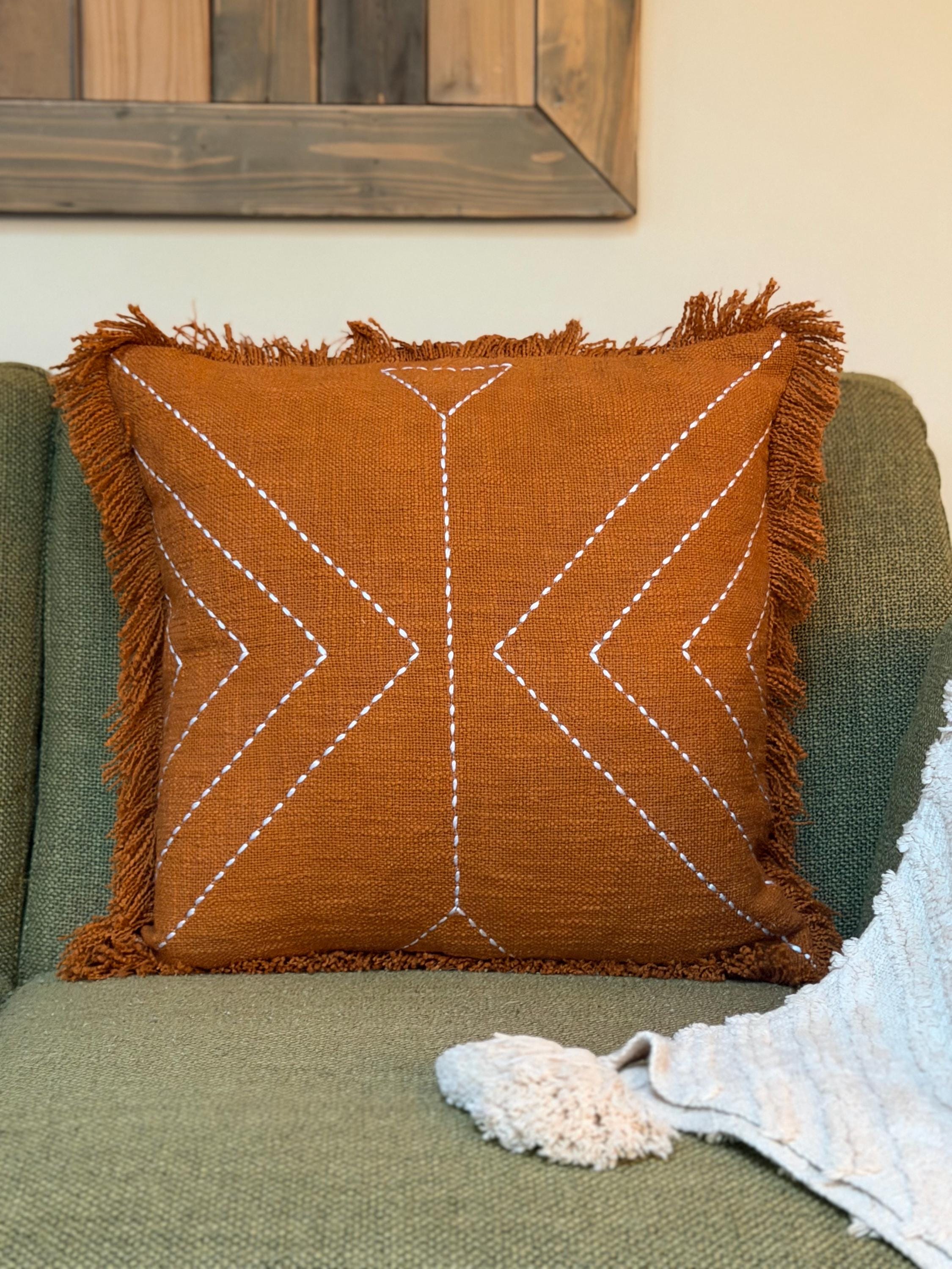 The Arrow Ridge Pillow is defined by movement and texture. Set in a warm rust tone with hand-stitched ivory detailing, its geometric lines draw the eye inward, creating a sense of direction and balance inspired by ridgelines and open terrain.
