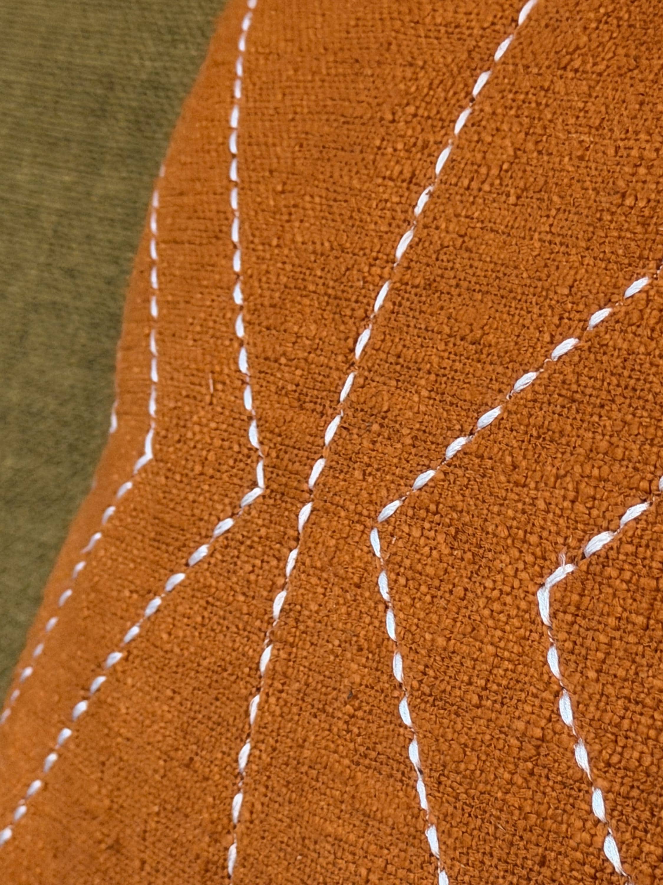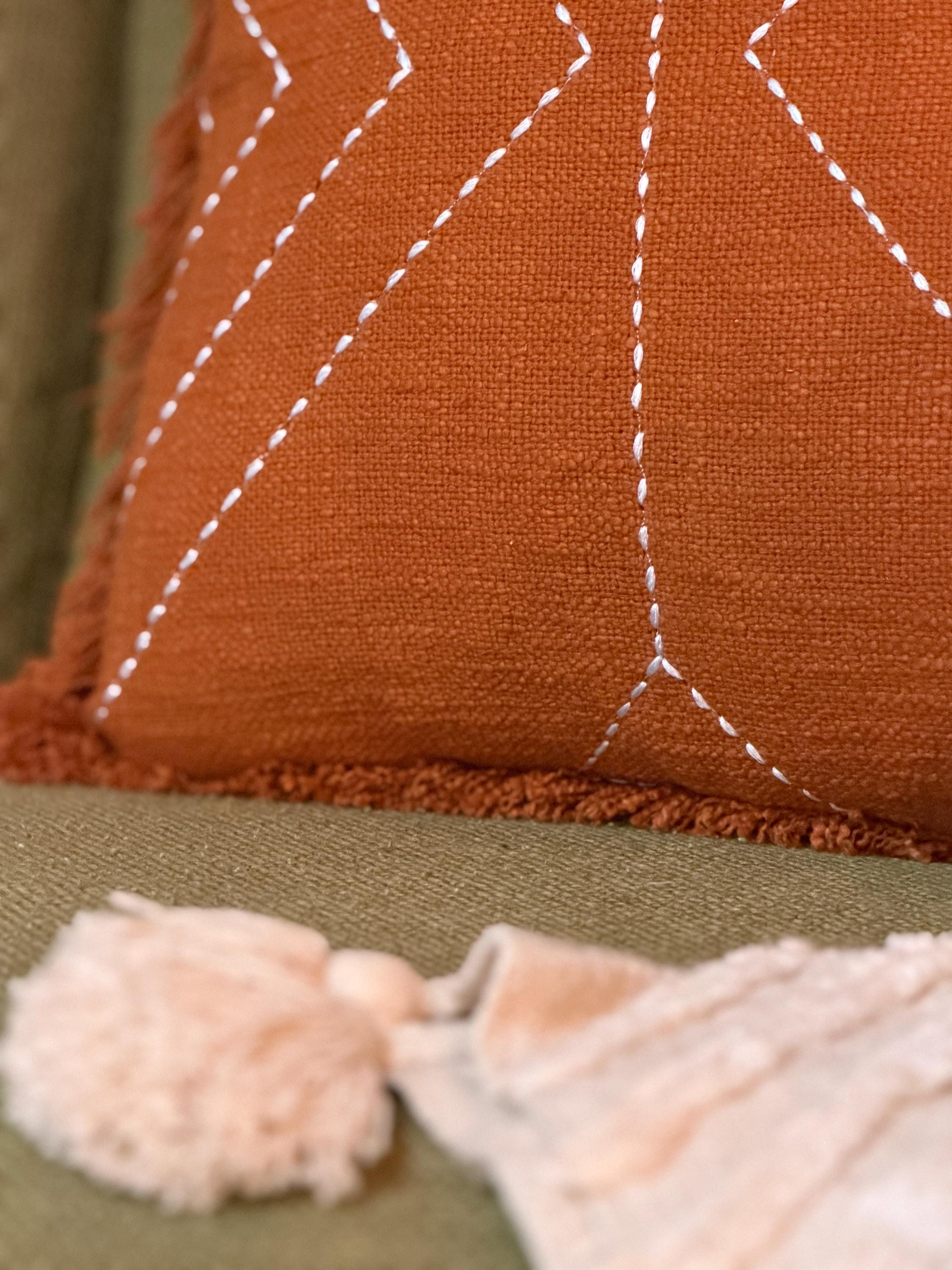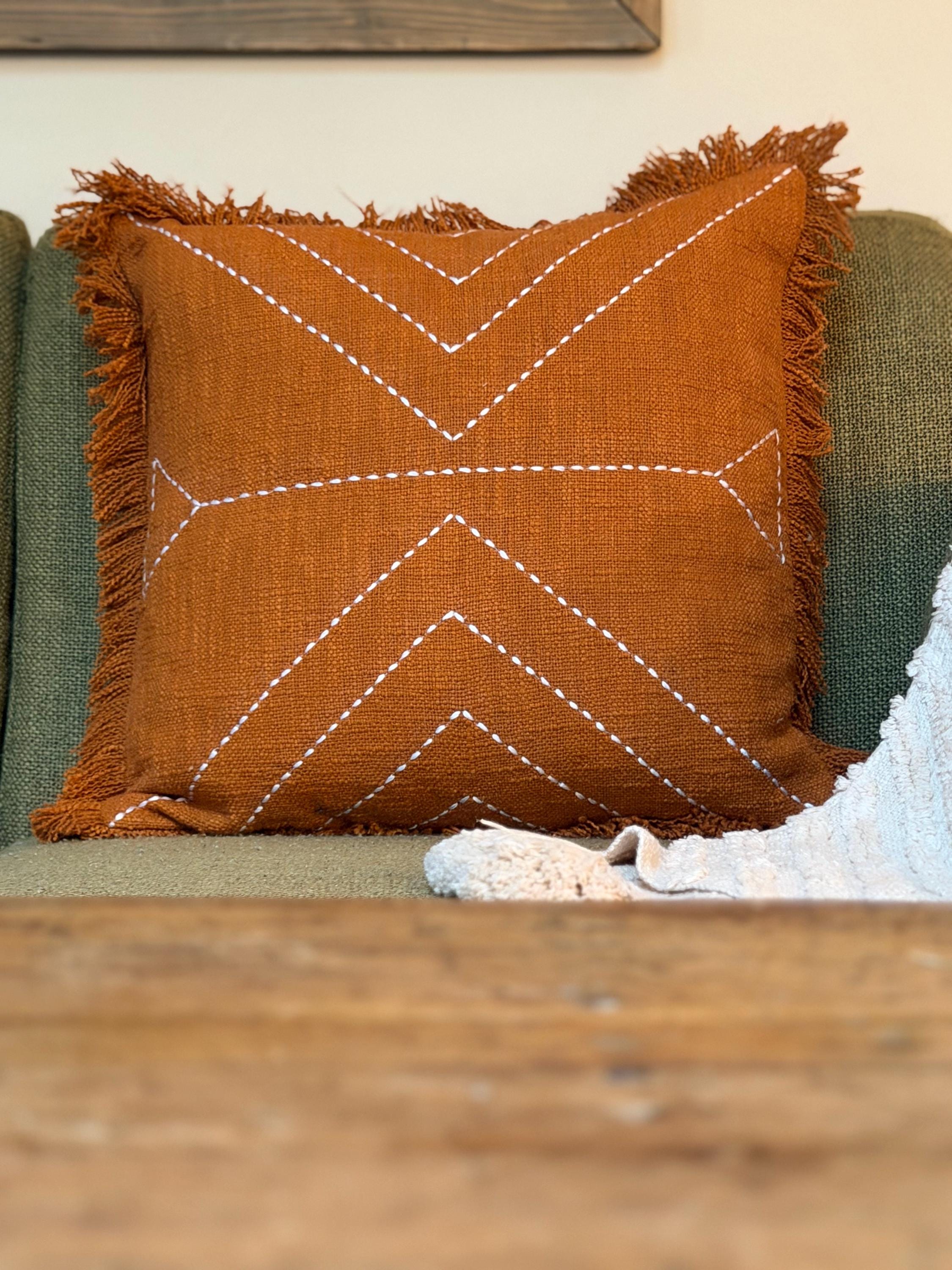 The Arrow Ridge Pillow is defined by movement and texture. Set in a warm rust tone with hand-stitched ivory detailing, its geometric lines draw the eye inward, creating a sense of direction and balance inspired by ridgelines and open terrain.