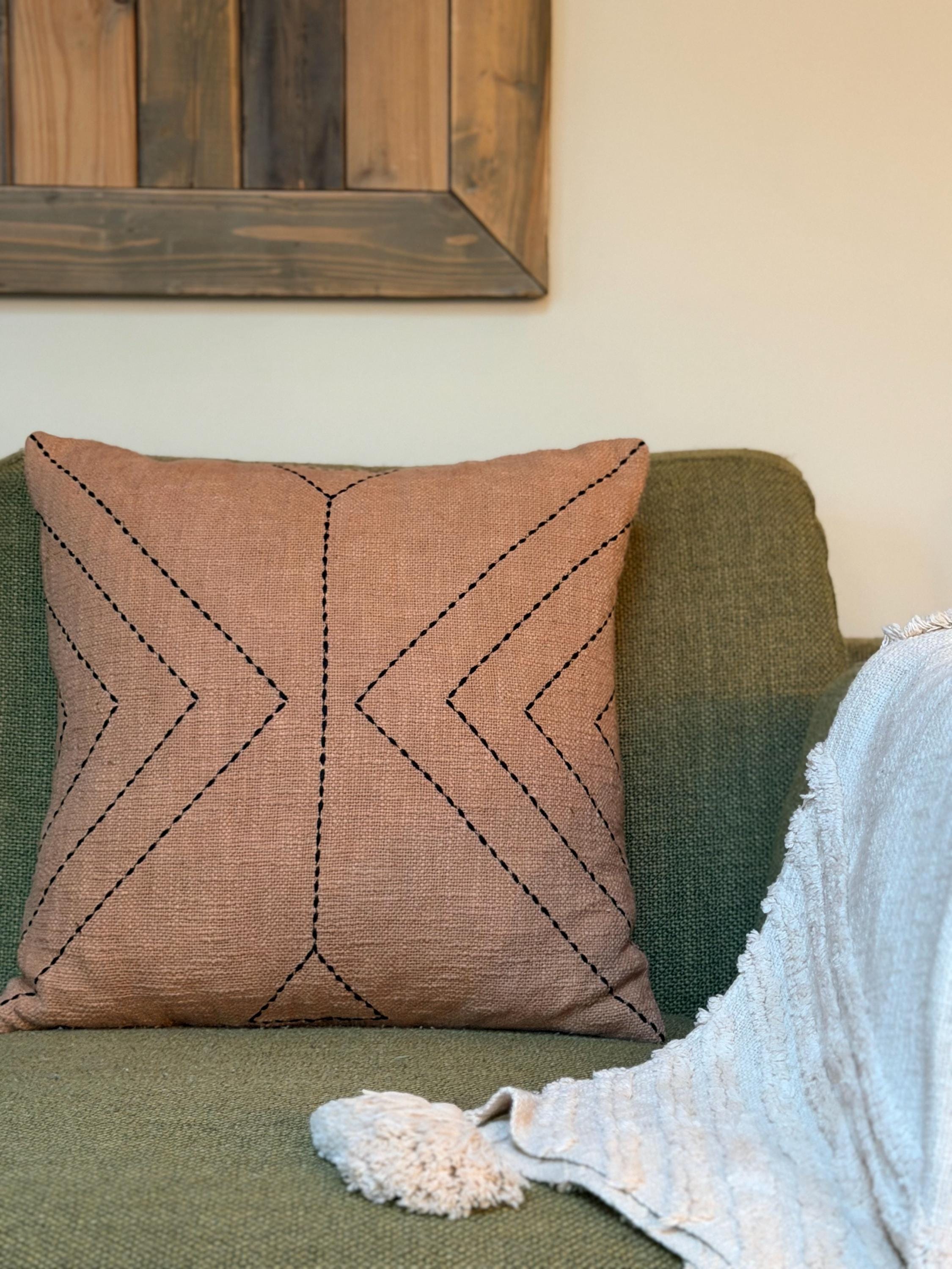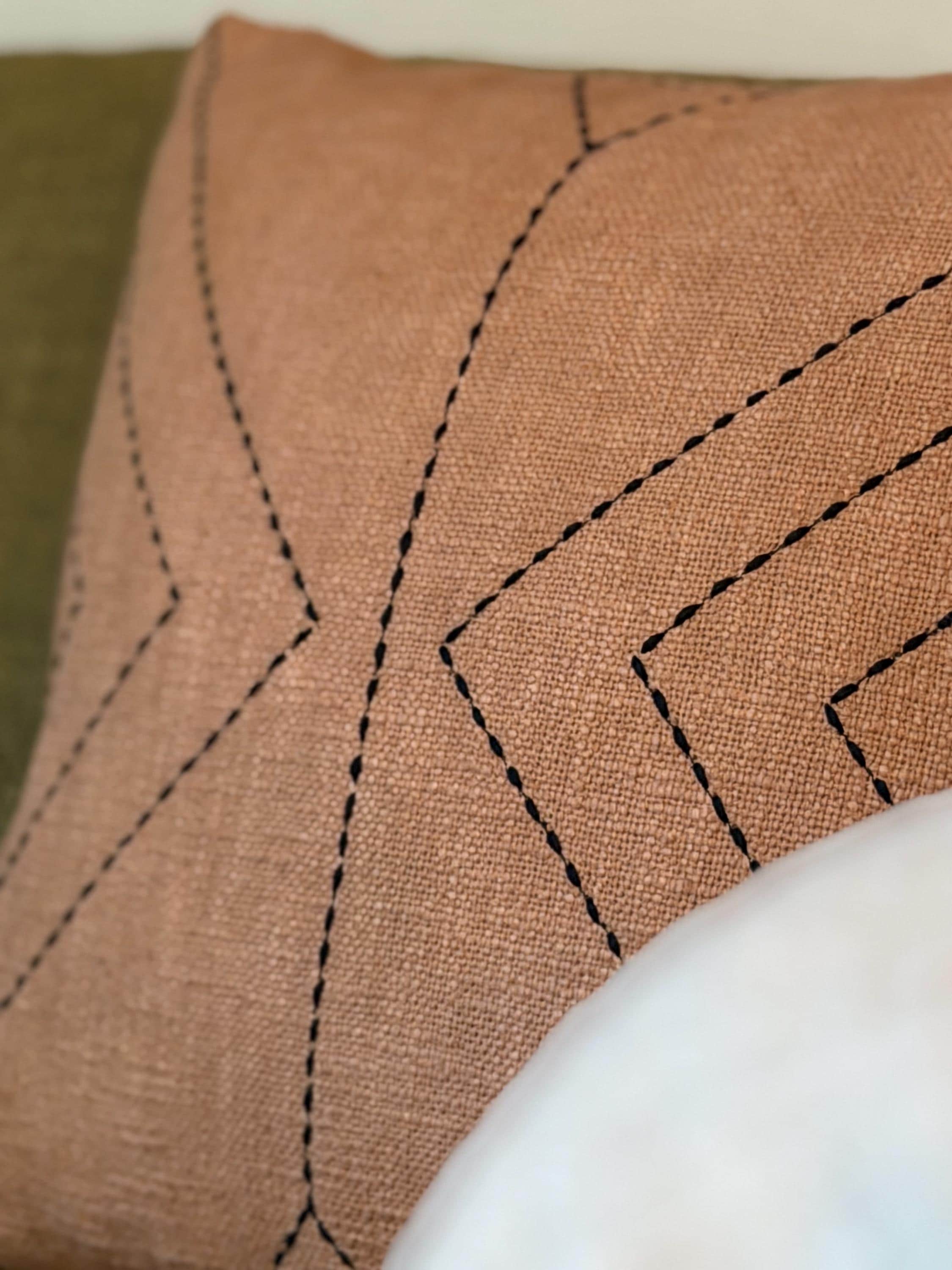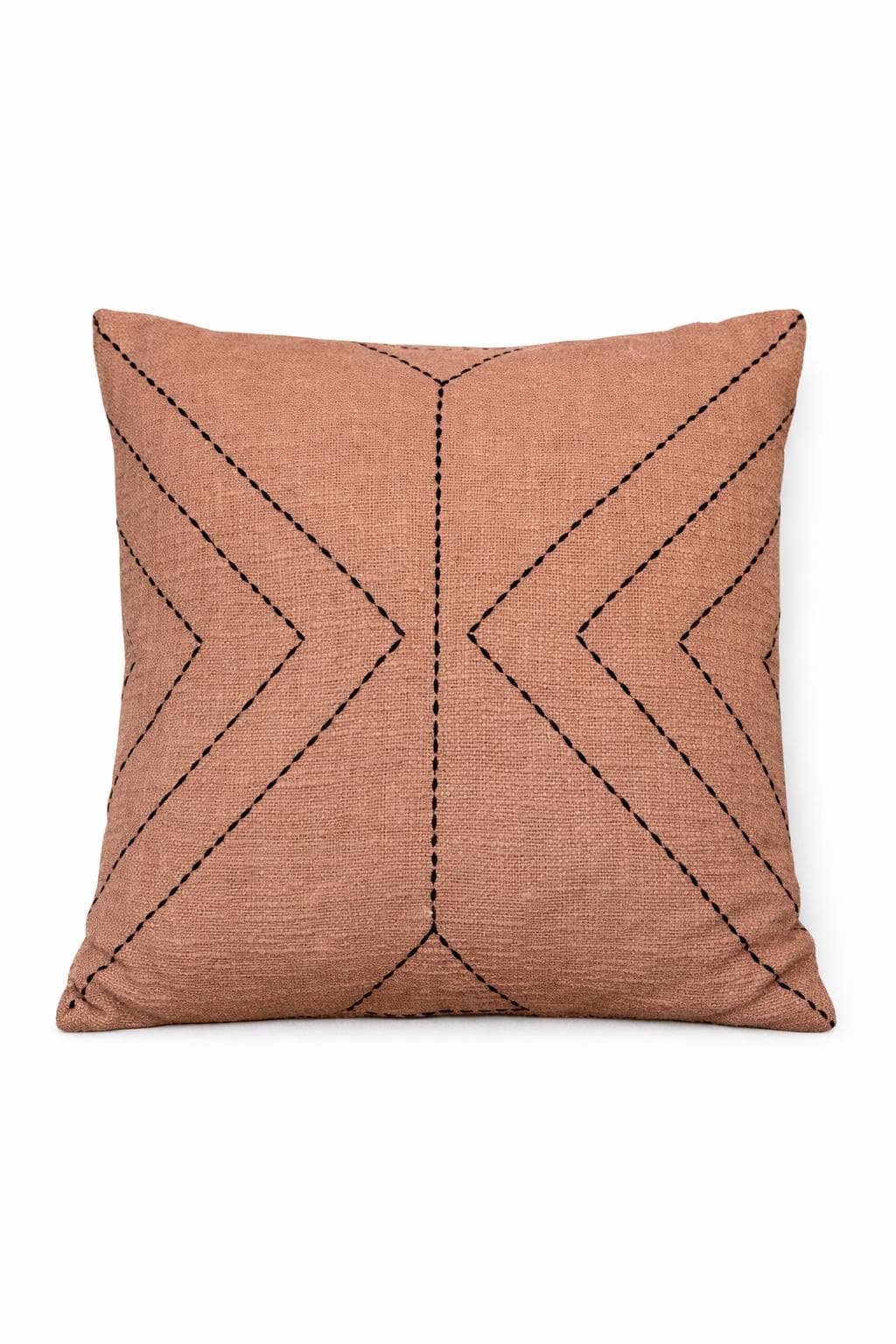 The Clay Ridge Pillow is crafted in a warm clay-toned textile with subtle black stitched detailing, its geometric lines create gentle movement inspired by ridgelines shaped slowly over time.