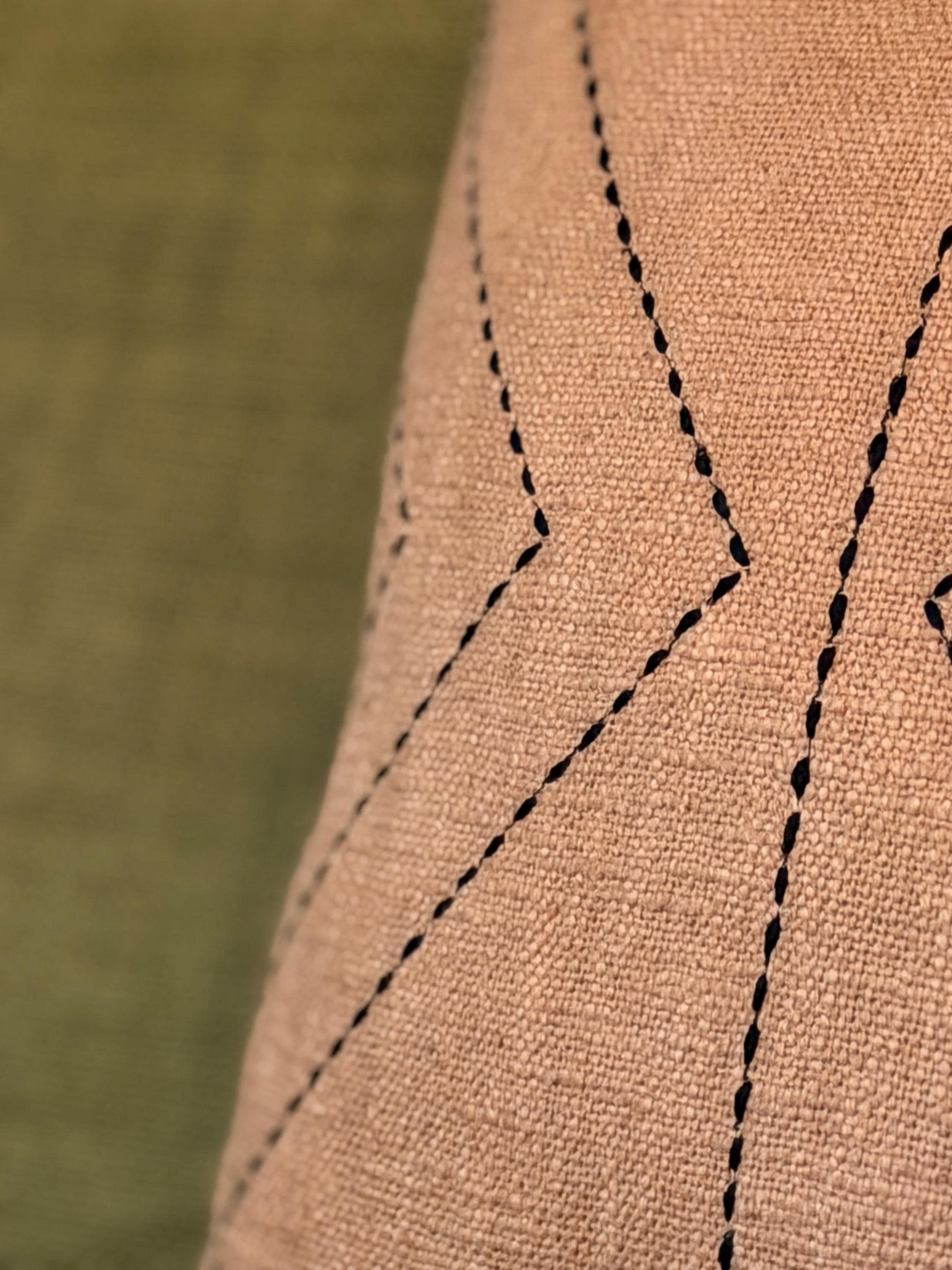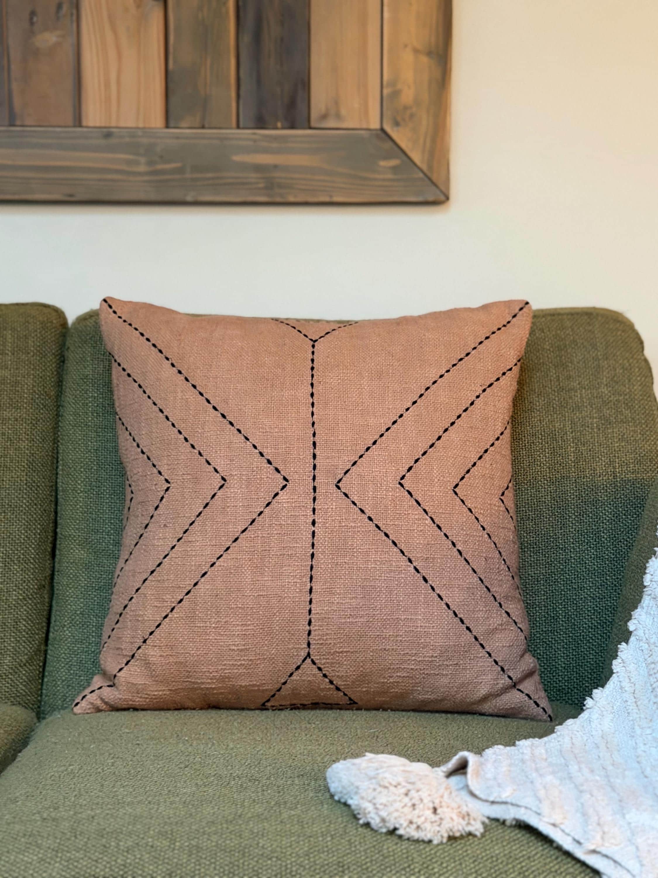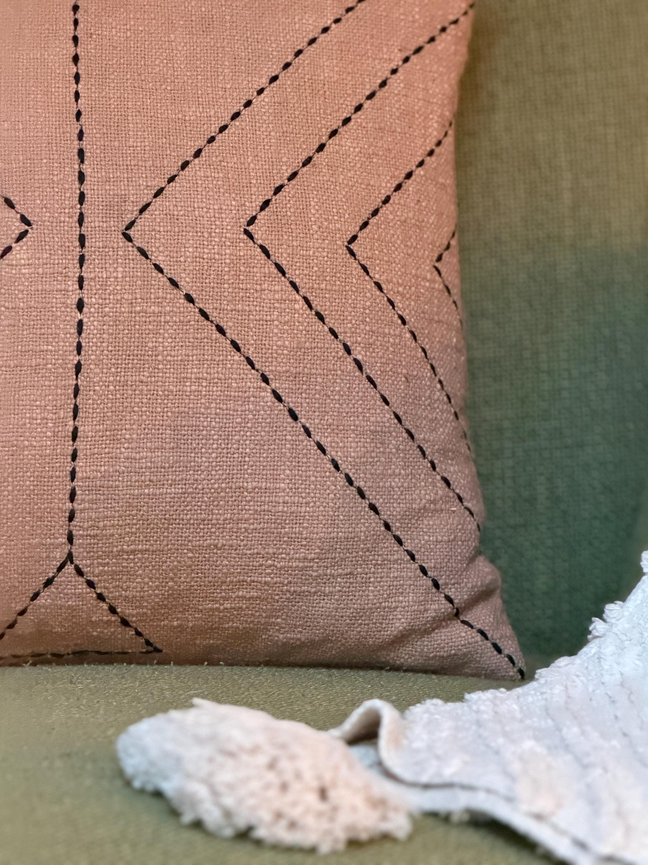 The Clay Ridge Pillow is crafted in a warm clay-toned textile with subtle black stitched detailing, its geometric lines create gentle movement inspired by ridgelines shaped slowly over time.